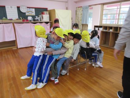 今年度の縦割り保育は内容を見直し、『仲良しデー』と『クッキングおやつデー』という交流日を設けています。仲良しデーとは、午前中から縦割りグループで過ごし、昼食終了後まで一緒に過ごす日を言います。(ちなみに「クッキングおやつデー」はクッキングの日に2クラスずつ分かれ、3つのグループでおやつを食べる日を言います) さて今日はその「仲良しデー」の日でした。運動会の練習などもあり、しばらくの間、縦割り保育活動が行えていなかったのですが、それぞれのグループの部屋に分かれても大きなトラブルもなくスムーズに縦割り保育が行えたように思います。天気が良かった事もあり、園庭でシャボン玉をするグループ、グランドで三輪車遊びをするグループ、お散歩に出かけるグループ、そして園内ではミニ運動会をするグループ、制作をするグループなど、それぞれ工夫をこらして触れあいました。またそれぞれのグループで大きい組さんが小さい組さんのお世話をするほほえましい姿が見られました。