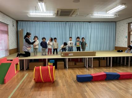 11月29日に行う「乳児クラスの発表会」に向けて第1回目の全体練習を行いました。まだまだ練習段階で、ステージに立つだけで涙が出てしまう子もいましたが、3クラス合同の「音楽遊び」では楽しく楽器や手拍子をして楽しく振舞う事ができました。これから乳児クラスは3回の全体練習を経て、29日の発表会を迎えます。ちなみに幼児クラスは12月6日(土)の発表会に向けて 5回の全体練習を行います。練習を重ねて日々上達し、本番で素敵な唄・演技を見せてくれるのが楽しみですね。