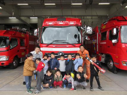 子ども達はクラス毎に消防署の方と一緒に写真を撮ってもらい、満足な気持ちを味わうと共に、改めて「避難の大切さ」を思い返す機会となりました。