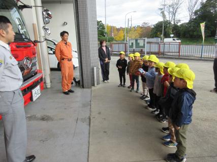 11月12日には、ぱんだ組の子ども達が宮津与謝消防署に見学に行かせていただきました。日ごろ、消防車などの特殊車両に興味を持っている子ども達なので、今回間近に消防車やはしご車などを見せていただき 大喜びでした。また防火服を着せてもらったり、大きなカッターで鉄パイプを切る様子を見せてもらったり、普段では体験できない貴重な体験をさせていただきました。消防署の見学の後は、「阿蘇シーサイドパーク」まで歩きました。公園では大型遊具で遊んだり、お弁当を食べたりしました。大きな公園であり思う存分体を使って遊びこむことができました。今回は路線バスなどの公共の交通機関だけではなく、「福祉法人連携」の一環として、他法人のマイクロバスを利用させて頂き、快適に移動する事ができました。