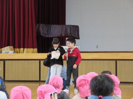 宮津小学校2年生の生徒さんが、みずほ保育園に来てくれ、授業で学んでおられる「お手紙」というお話の劇を見せてくれました。保育園を代表して ぱんだ組さんが見せてもらったのですが、最初はとても緊張ぎみでした。それでも劇を見せてもらった後の感想交流では「良かった」「かっこよかった」と感想をいう事ができました。そしてその後のふれあいの時間では「じゃんけん列車」や「猛獣狩り」をしました。そのころにはすっかり緊張も解け、笑顔が随所に見られ、小学校に進学する事への憧れの気持ちが大きくなりました。